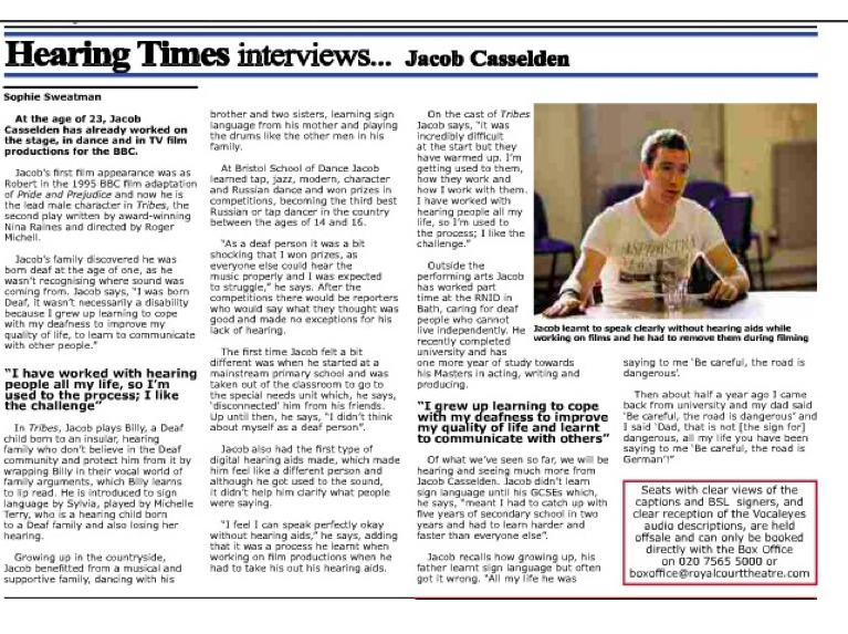 From 2007 to 2011, I wrote features for the Hearing Times, which included meeting and interviewing Deaf actors, artists, choreographers and advocates and I also wrote about hearing aids.